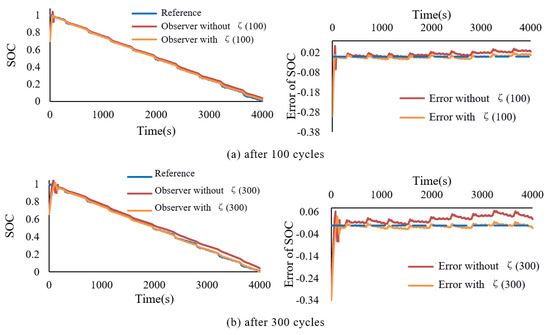 The battery multiplex DST experimental data under two different usage (after 100 discharges and 300 discharges) was used to verify the SOC estimation method mentioned. The values of the model compensation factor are calculated by Equation (13) to be 1.0999 and 1.211, respectively. Figure 10a,b contains the dynamic impedance of the battery measured, and model parameter R updated of the second-stage observer. The impedance R is greater than the dynamic impedance in order to compensate for part of the capacity degradation caused by battery aging. The deeper the battery ages, the greater the deviation between and .