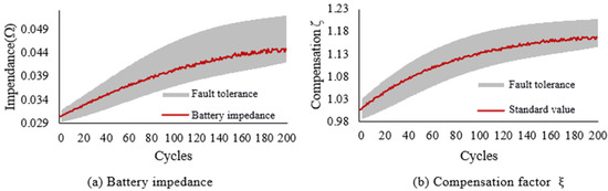 Inaccurate results of battery impedance directly affect the processing effect of the state observer. The red wave line in Figure 12a is the measured battery impedance under experimental conditions. The impedance gradually increases as the number of cycles increases, accompanied by significant fluctuations. As the number of cycles increases, the fluctuations also become more obvious. In addition, the measurement error will also have an impact on the calculation results of impedance, which increases the difficulty of accurate estimation of the SOC. Therefore, this section will analyze the fault tolerance of the compensation factor . The gray area in Figure 12a is the reasonable impedance calculated under the premise of accurate estimation of SOC, according to the DST cycle condition data under different cycle conditions of the battery. In other words, as long as the calculated result of the impedance R is located in the gray area in Figure 12a, the SOC estimation value is guaranteed to be within a reasonable range. Similarly, the reasonable system compensation factor is in the gray area in Figure 12b, and the standard system compensation factor is the red wave line in Figure 12b. As the battery usage increases, the accuracy of the system model may decrease, but the observer’s compensation factor and impedance estimation can have a larger fault tolerance area.
