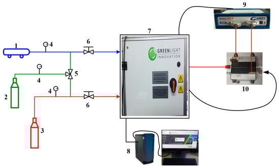 Schematic diagram of the experimental platform (1. air compressor, 2. N2, 3. H2, 4. pressure gauge, 5. triple valve, 6. reducing valve, 7. G20, 8. desktop, 9. electrochemical workstation, 10. PEMFC).