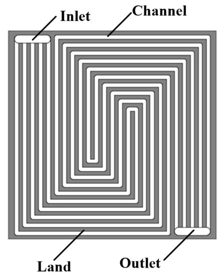 The schematic diagram of the experimental platform is shown in Figure 1. During the experiments, the polarization curve was tested by a G20 Greenlight Innovation fuel cell test station, which was used to control and monitor the electronic load (EE30180A; accuracy: ±1 mV), flow rate (Alicat mass flow controller; accuracy: 0.8% of reading), temperature, RH and gas pressure (accuracy: ±0.1 kPa). The impedance spectra were evaluated by the electrochemical workstation (Gamry Interface 5000E). All measurements were carried out in the galvanostatic mode with the frequency range 500 mHz–100 kHz during the test. The alternating current amplitude was set to 10% of the tested direct current value. The flow field of the single PEMFC used in this paper with 25 cm2 active area is shown in Figure 2; the channel height and channel width were both 1 mm. Besides, to reduce the experimental error and ensure reproducibility, some measures were taken during the test. The PEMFC with virginal MEA was preconditioned by operating with H2 (RH: 100%; flow rate: 400 mL/min) and air (RH: 100%; flow rate: 1200 mL/min) at 75 °C for 5 h. Two heating rods were placed in the anode and cathode endplates, respectively, and every flow field plate had a thermocouple to monitor the operating temperature. Several electric heating tapes between the humidifier and PEMFC were used to prevent any water vapor condensation. After changing the operating parameters (such as inlet RH, inlet pressure and operating temperature), they were kept for several minutes until reaching a steady-state reading. Additionally, before recording the output voltages under specific operating conditions, both sides of the PEMFC were purged with N2 (flow rate: 2000 mL/min; purge duration: 2 min) to remove water droplets and/or film in the flow channels. It is worth mentioning here that all experiments were conducted three times so as to ensure experimental reproducibility. The specifications of the components and operating conditions are listed in Table 1 and Table 2, respectively.