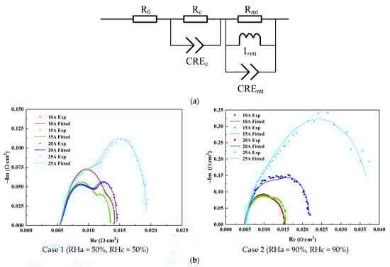 In order to analyze the ohmic resistance and mass transfer resistance, an equivalent circuit model shown in Figure 3a was applied to fit the experimental impedance spectra. In this model, polarization loss at the anode is neglected and R0 denotes the ohmic resistance, which is the conductance of protons. The parallel connection of Rc//CPEc reflects the medium-frequency arc. Besides, the parallel connection of Cmt//Rmt//Lmt is employed to investigate the mass transfer in PEMFC under a state of water flooding, and Rmt denotes the mass transport resistance due to oxygen diffusion in the cathode catalyst layer. The AC impedance spectrum and its fitted curves from 10 to 25 A are shown in Figure 3b. Each Nyquist plot exhibits either one capacitive loop or two distinguishable capacitive loops. The experimental results are in good agreement with the fitted data, and the chi-squared value is less than 0.001.