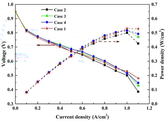 It is worth pointing out that the output voltage and power density are almost the same in case 3 and case 4, while the latter starts becoming higher than the former at more than 1.1 A/cm2. This is conducive to curing the membrane dehydration due to the electro-osmosis drag and to avoid exacerbating concentration polarization in the range of RHa from 50 to 70%. To show the effect of lower RH on the output performance, a dry case (case 1: RHa50%/RHc50%) was selected to compare with the above three cases. In the range from 0.6 to 0.9 A/cm2, the voltage of case 1 becomes higher than that of case 2 and comes close to those of case 3 and case 4. When the current density reaches 1.0 A/cm2, the values of case 1 exceed those of the other three cases. Obviously, the PEMFC working at the low RH conditions would have been suited to the high current density due to increased water generation.