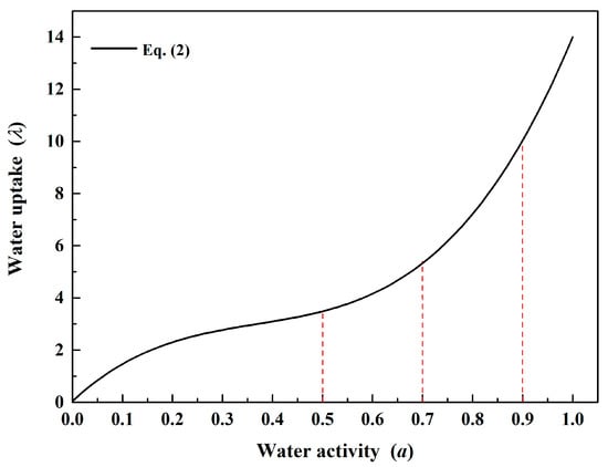 In order to explain the relation between the change in gas RH and the polarization curve, the ohmic resistance and mass transfer resistance were determined by the impedance spectra and equivalent electric circuit. According to Springer’s works [], the proton conductivity of the membrane, κe, is correlated with the water uptake (λ) and temperature (T) by Equation (1), and Equation (2) shows the water uptake as a function of the membrane water activity (a). At a steady state, the membrane water activity is equal to the local RH value near the membrane. Figure 5 displays the relation between water uptake and membrane water activity.
