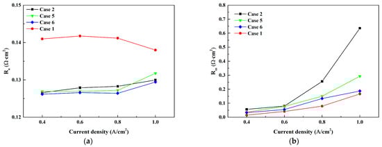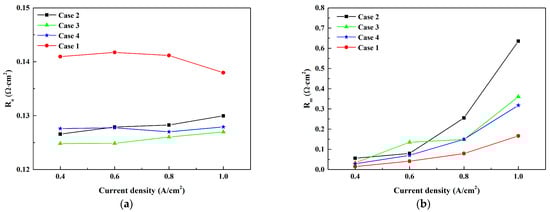 The ohmic resistance and mass transfer resistance are depicted in Figure 6. As for case 1, because the RH is only 50%, as can be seen in Figure 5, little water is absorbed by the membrane. Hence, its ohmic resistance can reach about 0.14 Ω·cm2, which is greater than that of the other cases (<0.13 Ω·cm2) within the current densities in Figure 6a. When the generated water is sufficient to keep membrane hydration at a higher current density (over 1.0 A/cm2), the ohmic resistance of case 1 in turn decreases. However, the low RH case has more advantages in avoiding water flooding in the PEMFC, causing the smallest mass transfer resistance. This is the reason that case 1 has a better performance than the other three cases at 1.0 A/cm2. Besides, the ohmic resistances in cases 2–4 keep rising gradually with the increase in current density. The augmentation of the working load not only produces much more water, but also relieves more heat, which tends to result in increases in the local temperature at the membrane, and this further results in decreases in the local RH and water activity of the membrane []. Hence, the ohmic resistances of case 2 are slightly higher than the values in case 3 and case 4, due to the comprehensive effects from local temperature and water activity. As depicted by Equation (1), the proton conduction capacity of the membrane is directly related to the RH and temperature. It is also interesting that excess water due to the increasing current density would accumulate in the GDL and CL, especially at higher RH conditions. It may hinder the gas transfer to the reaction point and lead to a larger concentration loss. Thus, the mass transfer resistance in case 2 increases dramatically to 0.75 Ω·cm2 at 1.0 A/cm2, leading to a sharp decline in the voltage of case 2 at a high current load, as shown in Figure 4.