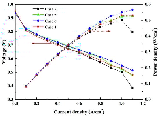 The cathode CL is the place where water is produced, and the inlet RHc has a direct impact on the water flooding and output performance. The results from the different RHc cases are shown in Figure 7. It is evident that case 5 and case 6 have similar change tendencies to case 3 and case 4 at the low and moderate current densities (≤0.8 A/cm2). Interestingly, the power density in case 6 is the highest, increasing to 0.57 W/cm2, and it is slightly greater than the maximum power density of case 5 (0.53 W/cm2) and 0.08 W/cm2 greater than that of case 2 (0.49 W/cm2). Since the RH of the cathode is directly related to the water accumulation in the cathode, it would be difficult for case 6, which has the lower cathode RH (RHc50%), to encounter water flooding along with the growth of the current. This is significantly different from the variation between case 3 and case 4 in Figure 4, and the effect on the output performance resulting from the changes in RHa is less remarkable than the impact from the variation in RHc.