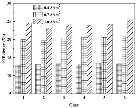 The PEMFC efficiencies at 0.4, 0.7 and 1.0 A/cm2 are given in Figure 9, for various RH cases. It becomes evident that an increase in the current density results in the apparent growth of the PEMFC efficiency. This value at 0.7 A/cm2 is almost twice as large as that with at 0.4 A/cm2. At low working current, the variations in the RH have little influence on the PEMFC efficiency, which is about 13.0% at 0.4 A/cm2. There is a considerable change in the same case when the current density is increased to 0.7 A/cm2, and the increment becomes reduced gradually from 0.7 to 1.0 A/cm2. This is because a large quantity of generated water at 1.0 A/cm2 is the main factor hindering the gas diffusion and slowing the electrochemical reaction rate. The diminished increase in the output voltage leads to the increment in the PEMFC efficiency being reduced. At this current density, the PEMFC efficiency in case 6 can reach the highest value, 24.4%, but the data in case 1 and case 2 are both lower than 23%.