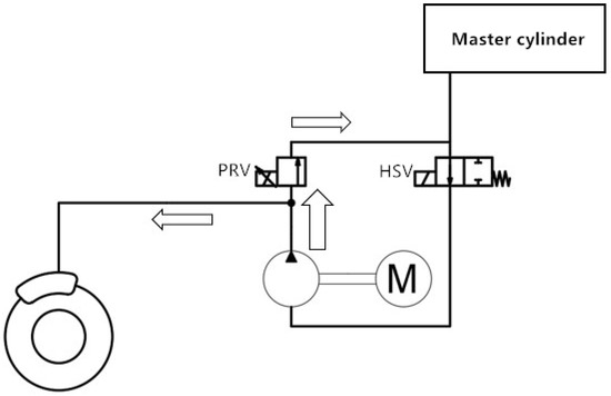When the regenerative braking system needs to be pressurized, HSV1 and HSV2 will be opened, and PRV1 and PRV2 will be closed. At this point, the hydraulic pumps pump the brake fluid into the wheel cylinders, and the pressure can be regulated by adjusting the driving current of PRV1 and PRV2. This process, including the working condition of the solenoid valves and the flow direction of the brake fluid, is shown in Figure 6.