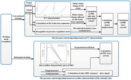 Shown in Figure 7 is the schematic representation of the pressure control algorithm. When the regenerative braking system is under conventional braking mode, the required fluid volume change of the PBC is calculated first based on the P-V characteristics of wheel cylinders and the expansion characteristics of the brake hose. Then, combined with the pressure regulation mode, the required PBC piston displacement is calculated. Lastly, according to the required displacement, the drive current of the PBC motor can be obtained. When the regenerative braking system is under redundant braking mode, it can calculate the drive current of the pressure regulation valves (PRV), based on the PRV overflow characteristics. Meanwhile, the drive signals of other RBU actuators can be obtained according to the relationship between the target pressure and actual pressure.