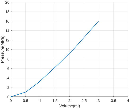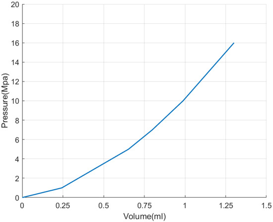 In order to generate the target pressure in the brake, it is necessary to control PBU to inject a certain volume of fluid into the brake. The required brake fluid volume can be obtained by interpolating the P-V characteristic curves of the front and rear wheel brakes, as shown in Figure 8 and Figure 9. If the target pressure is P, the required volume of brake fluid for all four brakes can be calculated as follows: