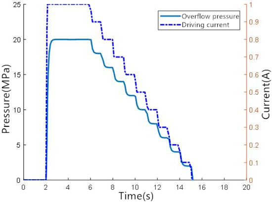 For the connection of the hydraulic components, the inlet port of the solenoid valve is connected to a constant pressure source and the outlet port is connected to the brake. By applying different driving currents to the solenoid valve, the pressure response curve can be obtained, as shown in Figure 11. It can be seen that in a certain range of driving current, the linear normally open solenoid valve shows a proportional overflow characteristic, which means the final steady-state overflow pressure can be adjusted by controlling the driving current.
