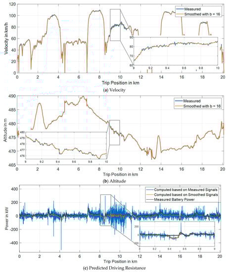 We applied a weighted moving average filter (Gaussian smoothing) to the signals since this allows noise to be captured and revised in even more dynamic sections without extensively disrupting the information in the data. After assessing the effect of the algorithm’s smoothing parameter (bandwidth b) on both input signals and the simulation output, we found that b = 16 was a reasonable choice for eliminating physically implausible values (outliers), as well as unrealistic profile characteristics (noise). For validation of the applied smoothing technique, we compared the measured battery power signal to the computed driving resistance power (Figure 2c). In the case of positive predicted driving resistance, the measured battery power is always slightly higher than the predicted driving resistance. This can be explained by the powertrain efficiency. Since the battery power supply must compensate for powertrain losses, the discharge battery power needs to be greater than the actual power required for propulsion on the wheels. For the case of negative driving resistance, the difference to the measured battery power is higher than for the case of positive driving resistance. This can be explained by the circumstance that the required braking power is not always supplied by the electric machine (recuperation) but by the vehicle’s friction brakes instead.