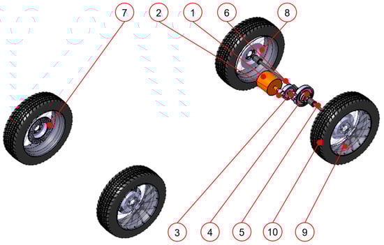 Knowledge of the drivetrain’s moment of inertia is needed to accurately estimate the vehicle’s driving resistance (Section 4.4.3). Due to the lack of available information in scientific publications on BEV drivetrain moments of inertia, we reverse-engineered a CAD model of a BEV drivetrain (Figure 3) on the basis of publicly available information.