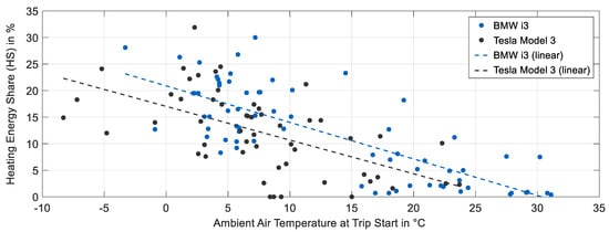 Figure 4 displays the heating energy share (HS) depending on the ambient air temperature at the start of all trips in the database (Section 3). Each data point in Figure 4 represents a single trip with the respective vehicle. When looking at the figure, it is evident that the heating energy demand correlates with the ambient temperature for both vehicles. More precisely, the HS increases as the ambient temperature decreases. The data dispersion for similar temperatures in Figure 4 results from different trip durations and different weather conditions (see the subsequent detailed analysis).