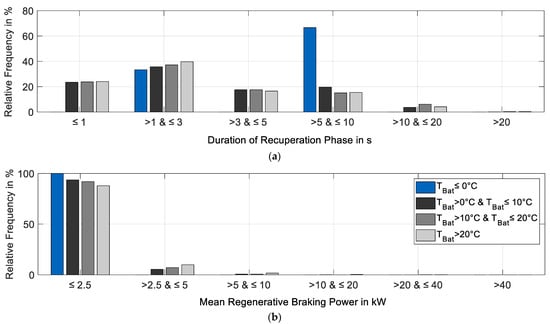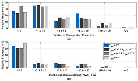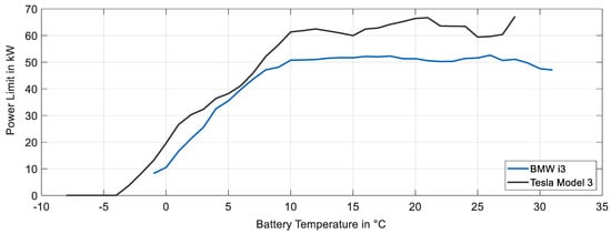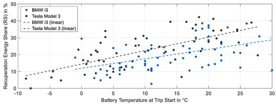 To gain a basic understanding of the vehicles’ ability to regenerate energy at different battery temperatures, the maximum detected recuperation power values in our database are plotted against temperature, as shown in Figure 5.