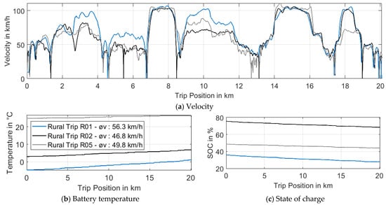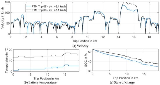 The trips within the database cover a wide range of ambient conditions as well as different battery temperatures, which is ideal for analyzing the effect of temperature on the vehicles’ recuperation and heating behavior. Due to the different project affiliations of the test vehicles, different routes with different planning backgrounds are present in the database. These routes can generally be classified into two categories. Trips on designed routes, on the one hand, and commuting trips on random routes on the other hand. Table 3 gives an overview of the random trips for both vehicles.
