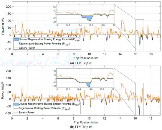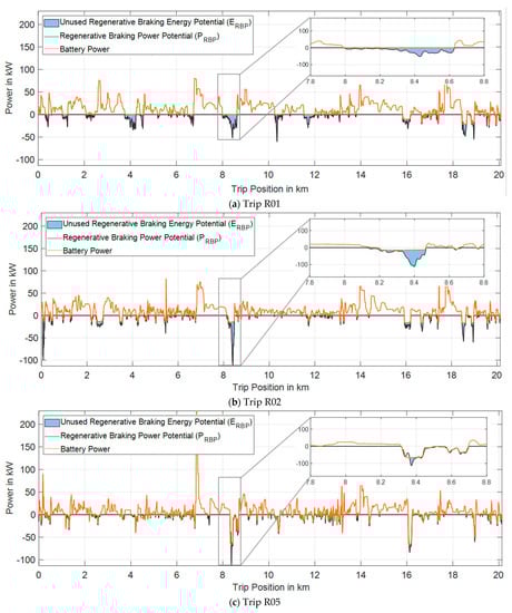 To enable a better trip comparison for the detailed recuperation analysis, some additional parameters besides the regenerative braking energy share RS (Equation (2)) are introduced. The first parameter is called regenerative braking performance RP (Equation (13)), and it quantifies how much of the predicted regenerative braking potential (Section 4.4.3) was used by the vehicle throughout a trip.