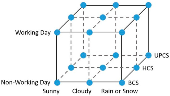 After expanding the original data, 18 charging scenarios can be divided according to three groups of status indicators: service type, weather condition, and day type, as shown in Figure 1. Based on the SOM, the massive charging records are going to be clustered through the three characteristic quantities of and , . Before clustering, they are standardized according to the maximum/minimum values of each characteristic. On this basis, in-depth analysis of the charging load structure and characteristics in each scenario are carried out.