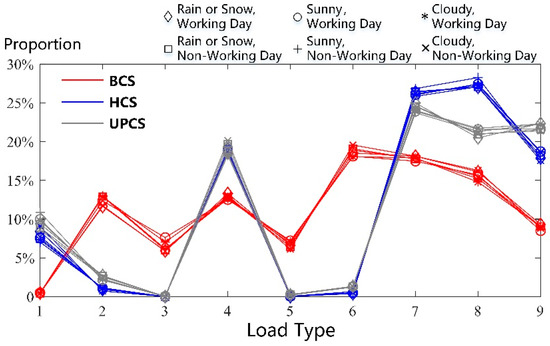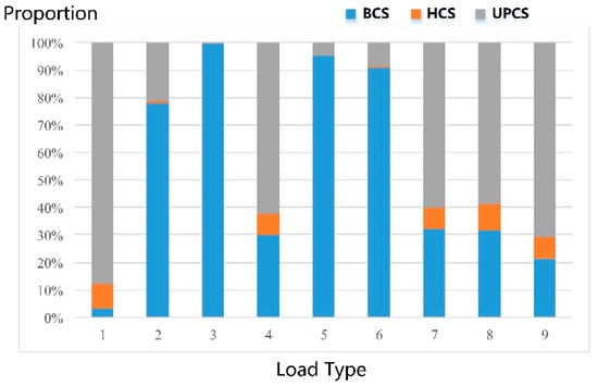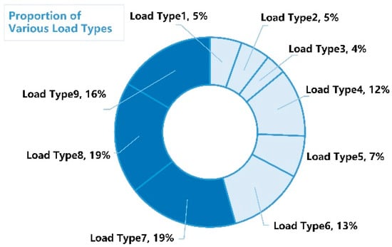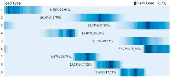 The calculation results of and are shown in Figure 7. Load types 4, 6–9 of which and are distributed around 20% have relatively similar characteristics. Load types 2, 3, and 5 have a relatively large duration while peak loads account for relatively small percentage. Load types 1 and 4, 6 to 9 have relatively similar small , which means the load concentration is weaker.