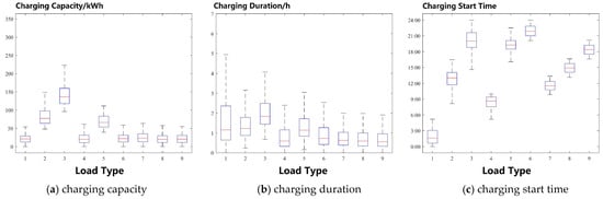 Load types 4, 6–9 account for nearly 80% of all charging records. The difference in the distributions of charging capacity and duration, of which the average values are between 21 and 24 kWh and 1.1 to 1.7 h, are not obvious. However, there are big differences in the distributions of charging start time, which are concentrated around 8:21, 21:57, 11:33, 14:57, and 18:23, respectively. Load types 2, 3, and 5 have larger charging capacity. Especially, load type 3 has an average charging power of 141.46 kWh. Load type 1 is concentrated around 2:00 in the morning, of which the average charging duration is more than 2 h with no particularly high charging capacity.