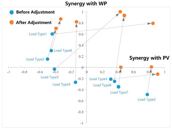 Calculate CN between different types of loads and wind power (WP)/PV output before/after adjustment. The results are shown in Figure 9. Before adjustment, load type 2 has good natural coordination with PV, with a correlation coefficient of 0.83. Load type 1 has good natural coordination with WP, and the correlation coefficient is 0.60. After adjustment, the synergies of various types of loads with PV/WP increased to a certain extent. It can be found that the displacements of load types 1 and 4 on the horizontal axis through adjustment are significant, indicating a greater potential for improvement in synergy with PV. However, load types 3, 5, 6, 8, and 9 have significant displacements on the horizontal axis, indicating that they have greater potential for improvement in synergy with WP.