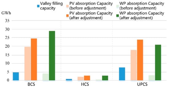 As shown in Figure 12, the V2G capacities of BCS and UPCS are much higher than that of HCS, which can provide about 4.51 GWh/year and 7.56 GWh/year of valley filling capacity, respectively. Before the smart charging adjustment, the BCS and UPCS can consume about 19.64 GWh and 17.92 GWh of PV, respectively, which can be increased by about 25% after adjustment. In contrast, smart charging has more room for promoting WP consumption, and it can reach more than 7 times the original consumption after adjustment.