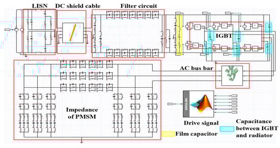 The radiated model in this paper is based on the common-mode current calculation of the system-level conducted emission co-simulation model of MEDS [11]. The conducted emission model is shown in Figure 1. The IGBT (Insulated Gate Bipolar Transistor, IGBT) module is the fundamental cause of periodic di/dt and du/dt changes. Therefore, an equivalent circuit model of nonlinear dynamic switching characteristics of IGBT is established. The impedance and parasitic parameters of the filter and the PMSM (Permanent Magnet Synchronous Machine, PMSM), which provide a high-frequency coupling path for conducted noise, are described by an accurate impedance equivalent model. Structure parameters of DC cable module, AC (Alternating current, AC) copper bar module, and near-field coupling, are extracted as RLC (resistance, inductance, capacitance, RLC) parameters by 3D finite element simulation. Based on SIMULINK software, the equivalent model of the driver signal of the MEDS is established, as shown by the MATLAB icon in Figure 1. By integration of models above into a circuit model, the prediction model of conducted interference simulation platform of the MEDS is established.