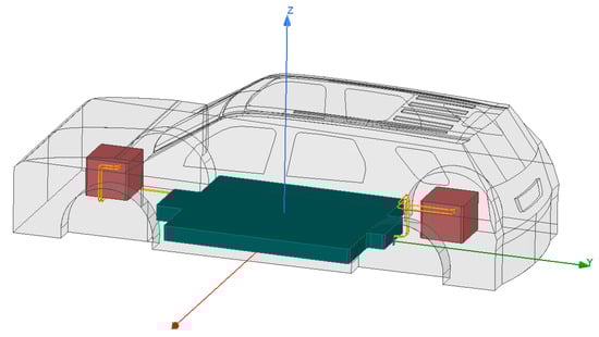The common-mode current extracted from the HVDC cable port of the MEDS was taken as the interference source, and the HVDC cable model was taken as the radiation antenna on the propagation path and imported into the vehicle model. Based on the models above, a vehicle-level radiated emission model integrating the interference source and interference propagation path was established, as shown in Figure 2.
