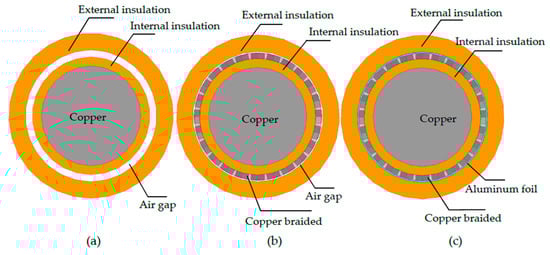 The HVDC shielding cable is used to transmit the energy of the battery pack to the power inverter and the three-phase AC drive motor, and it is crucial in the electric drive system model. Surface transfer impedance is an important parameter to describe the shielding efficiency of a high-voltage connection system. The smaller the transfer impedance is, the better the shielding performance of the shielded cable will be. The 3D electromagnetic modeling of transfer impedance for HVDC shielded cable is carried out based on high-frequency full-wave electromagnetic simulation software, as is shown in Figure 5. Cross-sections of three different cable models established based on finite element simulation software are shown in Figure 6; the finite element calculation is carried out by commercial software HFSS on the high-voltage shielding cable, and the transfer impedance value of each frequency band is obtained to evaluate the shielding effectiveness of the cable.