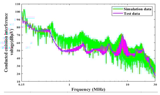 In this paper, the standard for CE simulation analysis of the MEDS is the international standard CISPR 25-2016 [13]. In order to verify the accuracy of the simulation model in Figure 1, the conducted voltage spectrum of the LISN port was calculated and compared with the tested results in the chamber, as is shown in Figure 7. The trend of simulation and measurement in the studied frequency band of 150 kHz~30 MHz is highly consistent, which proves the correctness of the simulation model and its modeling method. Therefore, the common-mode current extracted from the simulation model is relatively reliable as the interference source of the vehicle-radiated emission.