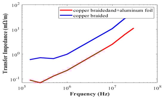 A comparison of the simulated transfer impedance between the shielding cable of single-layer copper braided and the shielding cable of double-layer copper braided and aluminum foil at 150 kHz~100 MHz is shown in Figure 8.