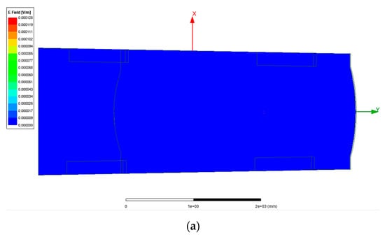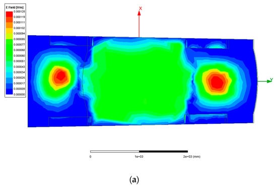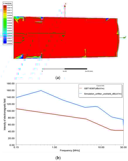 The common-mode current on the HVDC cable with a π-type filter and the unshielded HVDC cable were imported into the vehicle for frequency domain analysis. The calculated electromagnetic field distribution and EMF emission intensity at 3 m are shown in Figure 10.