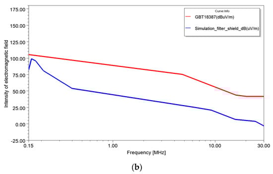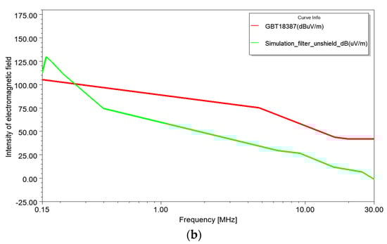 As can be seen from Figure 10, compared with the EMF intensity of the vehicle without the filter, the common-mode current and radiated emission are reduced significantly. However, the EMF still exceeds the standard at low frequency.