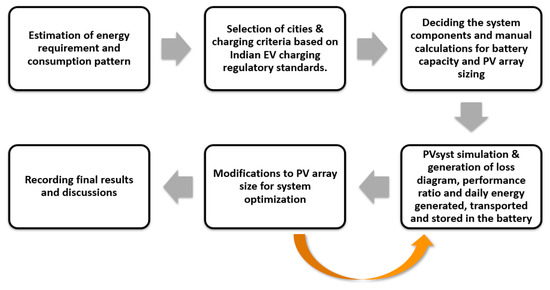 System sizing starts with identifying the standards and regulations for EV charging stations. This is followed by the selection of cities for which simulation will be performed. Solar energy is directly related to the location’s climatology; hence, comprehension and analyses of weather patterns become imperative. Next, a daily load for the charging station is decided, after which suitable system components are chosen and manual calculations are done to size the battery bank and the solar array capacity. Then, using simulation, the system performance is analyzed, and the array capacity is altered to minimize unwanted losses. Further simulations are performed on the new array capacity, and modifications are done if required. This is an iterative process, and amendments are made to attain the most optimized version of the solar PV system. Finally, the performance data, thus calculated, are recorded and compared for different locations. Figure 1 represents the system sizing methodology as a schematic.