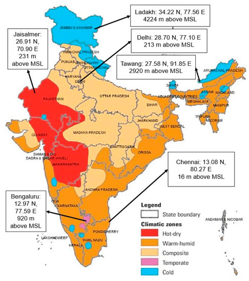 India is located in the northern hemisphere, with the Tropic of Cancer (23.5° N) passing through it. According to the National Building Code (NBC), India is majorly divided into five major climatic zones: cold, composite, hot & dry, warm & humid, and temperate [25]. For this analysis, six Indian cities have been selected, each featuring a different region and belonging to one of these climatic zones. The coordinates and altitudes for each of these cities are given in Figure 2.