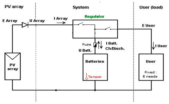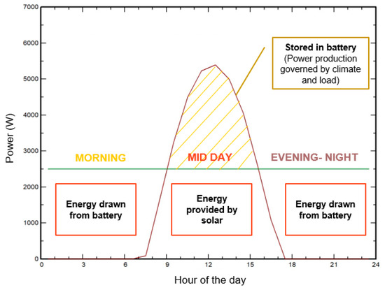 Any PV system sizing can be divided into two stages: preliminary calculations and system optimization. Usually, the client provides an initial value for any specific parameter, which becomes the base for all prelusive measures and further optimization. This boundary condition can vary from a budget limit to a spatial limit depending on the situation. Since this work does not predicate any such restrictions, the preliminary system sizing is initiated with the selection of the type of system. Here, off-grid PV system is chosen for the charging station. The load requirement is fixed and the load profile per day is determined. The entire battery bank and array have to be designed to sustain peak load demands for off-grid systems, resulting in extensive systems with high costs. Hence, for the charging station, the consumption profile is assumed to be constant throughout the day at 2.5 kW per hour, equivalent to a load of 60 kWh per day. Figure 3 shows the working of the off-grid PV system.