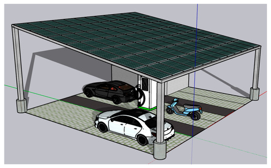 The selection of the station structure is another important criterion that depends on the solar PV application. A carport structure is preferred for the concerned design since this integrates the parking area with the array installation area. The array also acts as the roof for the parking zone and the battery room. Since most carport structure manufacturers allow only a 5–10° tilt, a south-facing roof with a 10° tilt is opted for the charging station. The azimuth angle of the solar array is entirely subject to the available space. Figure 4 shows a carport integrated charging station.