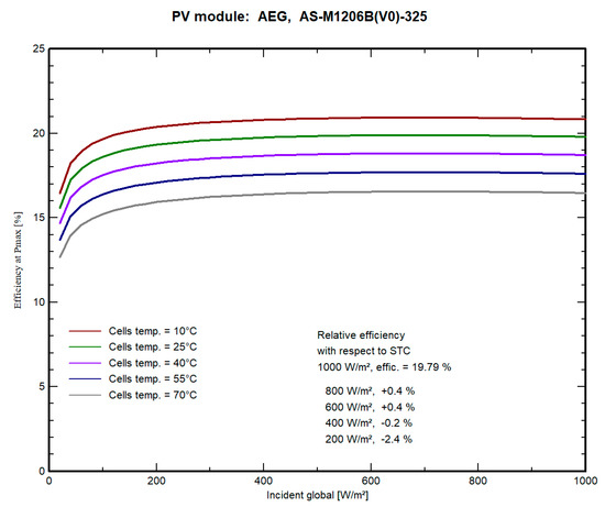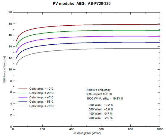 In this case, the aim is to compare two module technologies that would only be feasible if the modules are manufactured by the same company and have the same rated power. Modules with higher power ratings cost more but are required in less quantity. Minimizing the station area is also necessary for system optimization; hence, a higher power rating module has been selected. Two modules from ‘AEG Solar’ (a monocrystalline and a polycrystalline) of 325 Wp and 72 cells are selected (Figure 5) and compared for this design. The 325 Wp modules have been chosen since this was the highest common rated power in the PVsyst database for two different module technologies from the same manufacturer. Monocrystalline technology is more efficient and more expensive, while polycrystalline technology is less efficient and cheaper. The modules’ responses to variations in temperature and irradiation differ, since the actual conditions are not similar to the ‘Standard Testing Conditions (STC). Therefore, the polycrystalline module has been used for the initial array optimization part. The system performance data have been generated with both the modules and are mentioned in Section 3. Figure 5 and Figure 6 show the efficiency curves for the monocrystalline and polycrystalline modules, respectively.