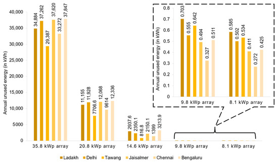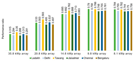 - Out of all the array sizes selected, the 8.1 kWp solar PV system with two days of battery autonomy (129.6 kWh battery capacity) has the fewest unused energy losses and a good PR in all six of the cities: Delhi, Chennai, Jaisalmer, Tawang, Ladakh, and Bengaluru.