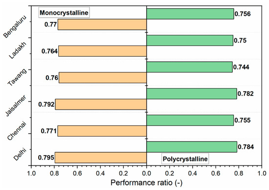 From the energy balance data generated using PVsyst, the monthly and annual energy supplied by the system to EVs can be tabulated. The energy generated and provided by the 8.1 kWp charging station in each city is different for each month and varies depending on the climatic factors present there. Figure 11 shows the PR comparison for the system using monocrystalline and polycrystalline modules.