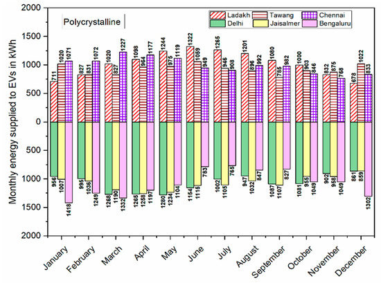Monthly variation in energy supplied to EVs by the charging station using polycrystalline modules.