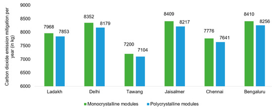 The decrease in emissions has been computed with respect to the amount of CO2 that would have been emitted if the same amount of energy was taken from the grid (proportionate to the share of different energy generation sources contributing to the grid). Figure 16 shows the reduction in emissions by the system using monocrystalline and polycrystalline panels.