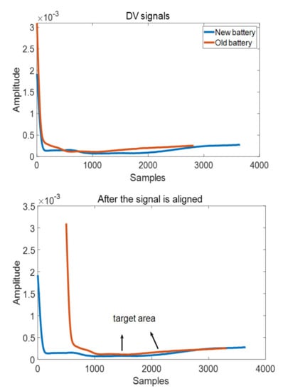 As shown in Figure 1 below, as the lithium battery ages, the overall DV curve shifts to the left. At this time, the difference between the two DV curves cannot be directly analyzed. Take the complete DV curve of the new battery as a benchmark and use the DTW algorithm to align the DV curve of the same battery at different aging stages with it, and then calculate the points and points between the two curves after alignment within the range of 40–60% SOC. The Euclidean distance is taken as one of the characteristic parameters that characterize the aging state of the lithium-ion battery.