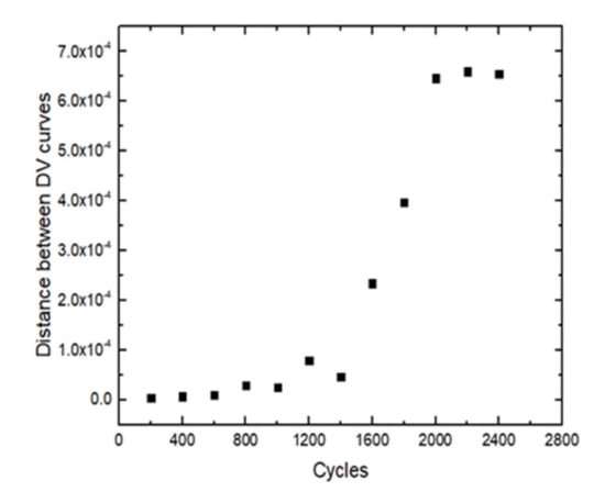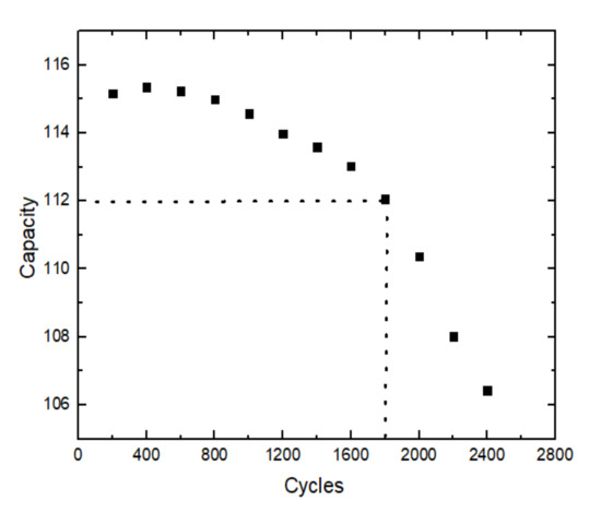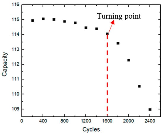 The following Figure 3 shows the capacity change of a certain type of ternary lithium-ion battery during the aging process. The experiment does a capacity calibration every 200 cycles, and the capacity of the lithium-ion battery begins to dive around 1400 cycles. Figure 4 shows the variation of the average distance between the 40–60% SOC of the lithium battery DV curve with the number of cycles, and Figure 5 shows the change of the minimum valley value at the bottom of the DV curve of the lithium battery with the number of cycles, at 1600–1800 cycles. When the left and right lithium batteries begin to accelerate the aging of the inflection point, the characteristic parameters in Figure 4 and Figure 5 also expand rapidly, indicating that the speed of the DV curve shifts upward after the accelerated aging of the lithium battery increases. Figure 6 shows the change of the main peak area of the lithium battery IC curve with the number of cycles. When the lithium battery capacity is in the linear decline stage, the main peak area of the IC curve also linearly declines, and when the lithium battery capacity starts to dive, the main peak area also drops rapidly, appearing at the obvious inflection point. Therefore, the characteristic parameters that are related to the accelerated aging of lithium-ion batteries include: the area of the two peaks of the IC curve, the distance between the DV curve (40–60% SOC), and the minimum valley of the DV curve. At the same time, for the main peak, the characteristic parameter of area is further processed. Taking the main peak area of the IC curve of the new battery as the benchmark, the difference between the main peak area of the IC curve obtained at different subsequent cycles and the difference sequence of the main peak area is obtained, and this sequence is used to represent the lithium battery rate of decline of aging.