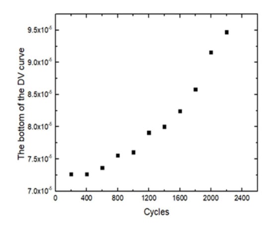 At the same time, the height of the main peak of the IC curve has a strong linear relationship with the capacity of the lithium-ion battery. When the capacity of the lithium- ion battery continues to decline with the deepening of aging, the height of the main peak also decreases, and the height of the main peak of the IC curve corresponds to the DV trough on the curve; therefore, the minimum trough of the DV curve can be used as one of the characteristic parameters to characterize the aging state of the lithium battery.