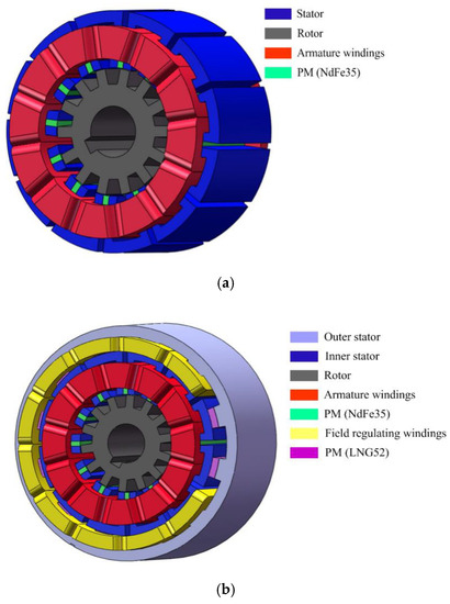 The two kinds of flux switching machine considered in this paper are shown in Figure 1. Figure 1a shows the classical structure of FSPM machine. If the FSPM machine in Figure 1a is surrounded by the outer stator, filed regulating windings and permanent magnet LNG52, the device becomes a novel machine, namely the VFMPM machine, as shown in Figure 1b.