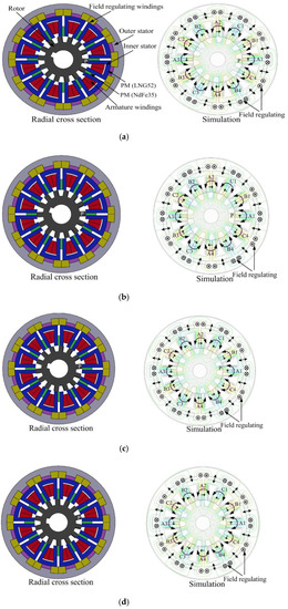 - Yang, G.; Fu, X.; Lin, M.; Li, N.; Li, H. Comparative Study of Flux Regulation Methods for Hybrid Permanent Magnet Axial Field Flux-switching Memory Machines. J. Power Electron. 2019, 19, 158–167. [Google Scholar]