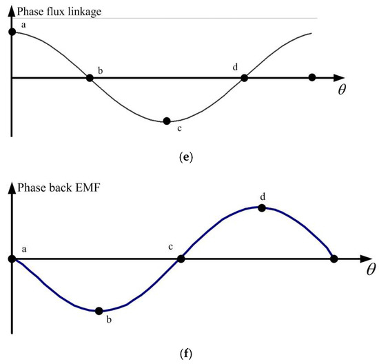 The operation process of the back EMF waveform period can be divided into four main positions. When the relative position of rotor tooth (P point) and phase winding A1 is shown in Figure 2a, the flux linkage of phase A is maximum, as shown by point a in Figure 2e. Conversely, the flux linkage of phase A is minimum (point c in Figure 2e), since the relative position of rotor tooth (P point) and phase winding A1 is shown in Figure 2c. Figure 2b,d shows the zero-crossing of flux linkage, corresponding to point b and point d in Figure 2e.