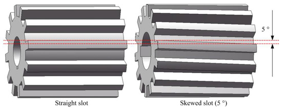 The detailed theoretical research of skewed-slot-type rotor can be seen in References [22,23,24]. In this section, the discrepancy between the straight-slot-type rotor and skewed-slot-type rotor is discussed through simulation and harmonics analysis.