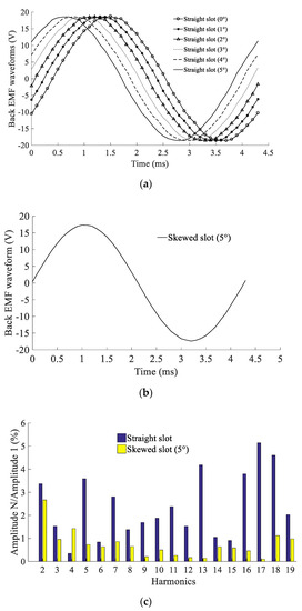 Back EMF waveform analysis of VFMPM machine. (a) Straight-slot-type back EMF waveforms (0°, 1°, 2°, 3°, 4° and 5° are the initial rotation degrees of rotor); (b) Skewed-slot-type back EMF waveform; (c) Back EMF harmonics comparison of straight-slot type and skewed-slot type.