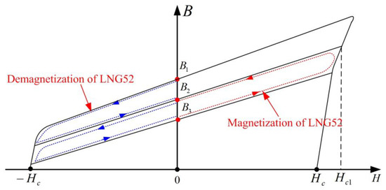 According to the electromagnetic theory of permanent magnet [25,26,27], Figure 5 indicates that the no-load working point of LNG52 can be shifted by changing the amplitude and direction of current of filed regulating windings. For example, after applying a negative pulse current with appropriate amplitude to the filed regulating windings, the no-load working point of LNG52 can be demagnetized from to . On the contrary, the no-load working point of LNG52 can be magnetized from to by the opposite current of filed regulating windings. If the amplitude of pulse current is large enough, the magnetization and demagnetization process can occur in the third and fourth quadrant of Figure 5 (not drawn).